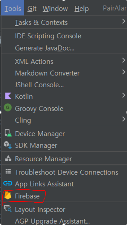 2. 상단의 [Tool] -> [Firebase] 클릭