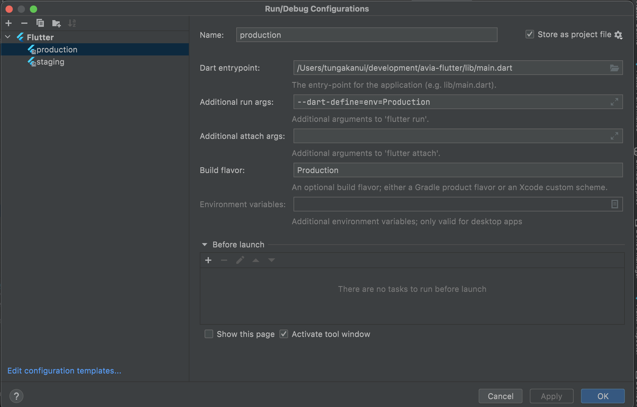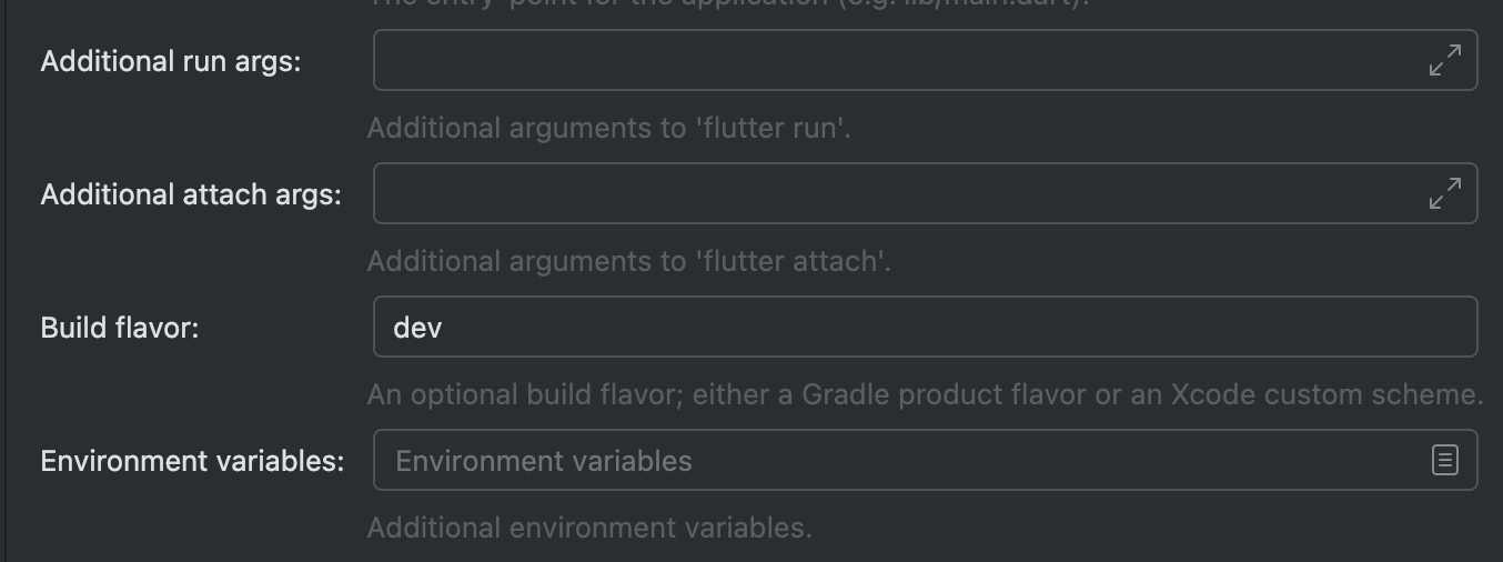flutter run --flavor dev --dart-define=ENVIRONMENT=dev --dart-define=API_URL=https://dev.api.example.com