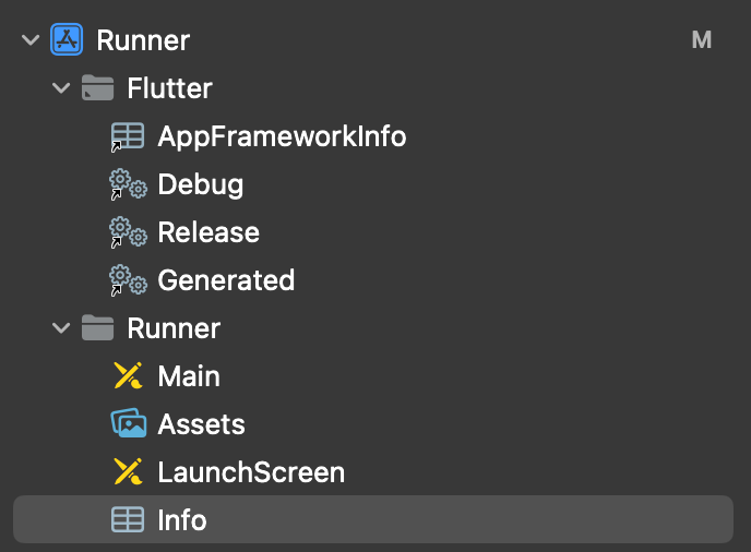 - Xcode의 프로젝트 내비게이터에서 Runner 폴더 아래의 Info.plist 파일을 엽니다.