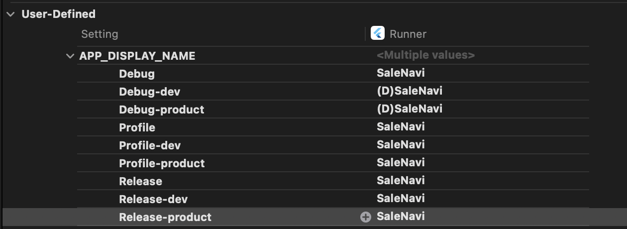 - APP_DISPLAY_NAME 변수를 펼쳐서 각 Flavor 설정에 맞는 앱 이름을 입력합니다. (예: Debug-dev와 Release-dev에는 '나의 앱 Dev', Debug-product와 Release-product에는 '나의 앱')