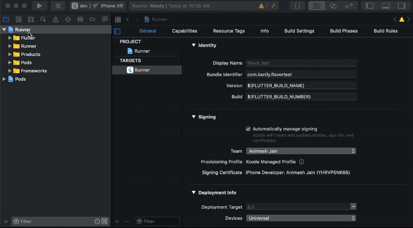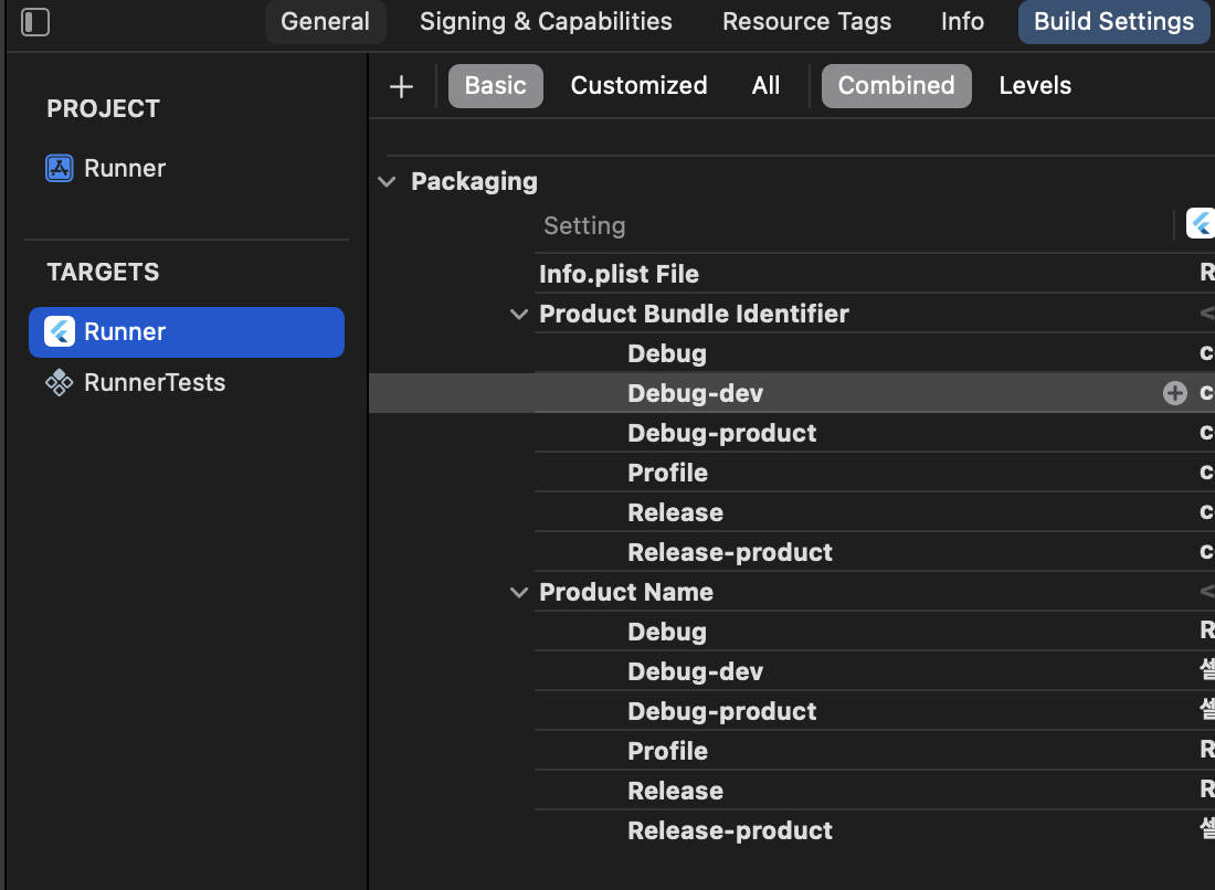 - 프로젝트 내비게이터에서 Runner를 선택하고, TARGETS에서 다시 Runner를 선택합니다.
