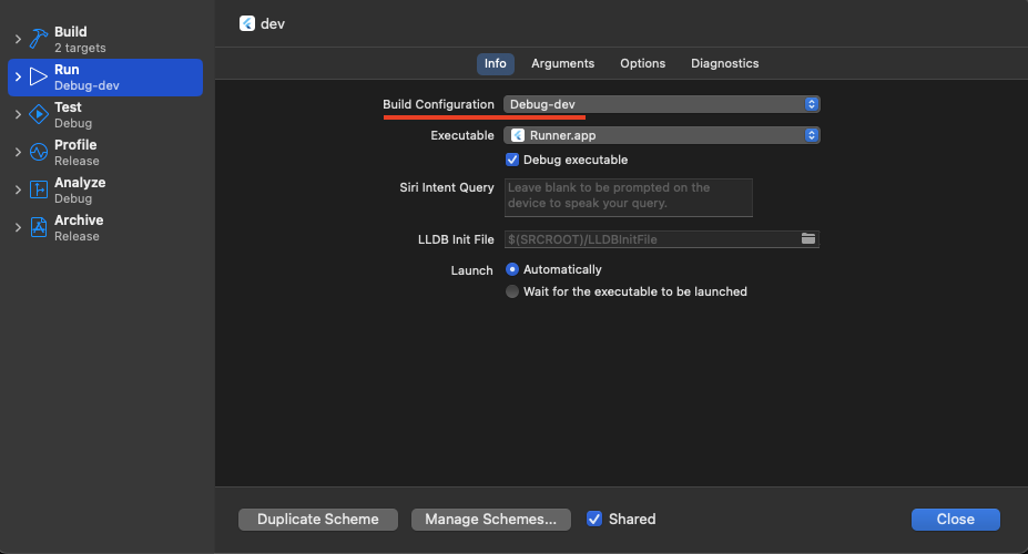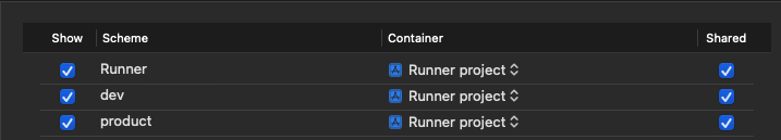 빌드에 대한 이름과 환경을 만들었으니 iOS 프로젝트에서 해당 빌드를 인식할 수 있게 Scheme을 새롭게 만들어줘야 합니다.