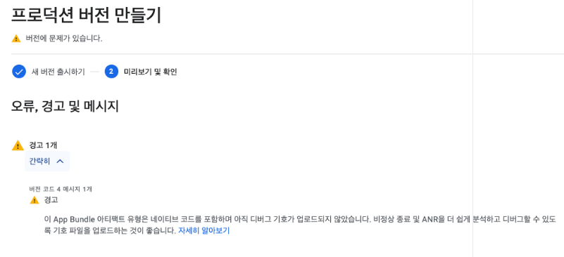 이 App Bundle 아티팩트 유형은 네이티브 코드를 포함하며 아직 디버그 기호가 업로드되지 않았습니다.