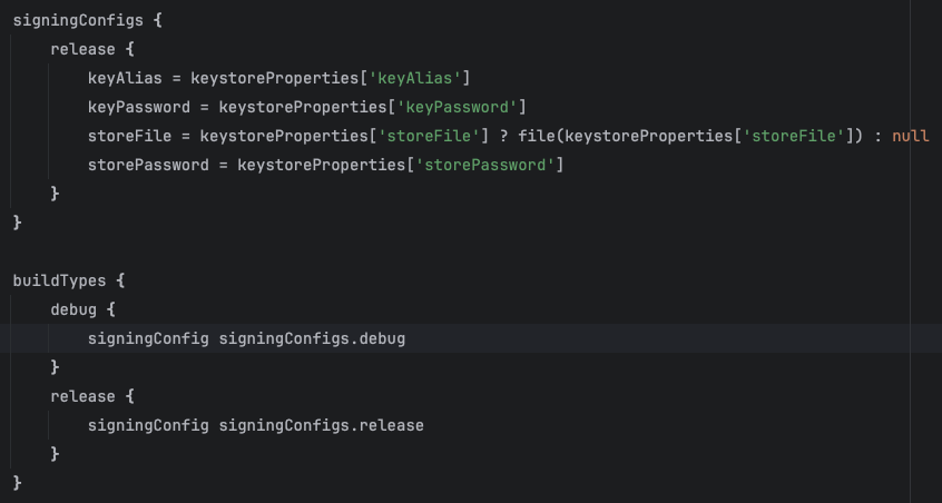 storeFile = keystoreProperties['storeFile'] ? file(keystoreProperties['storeFile']) : null