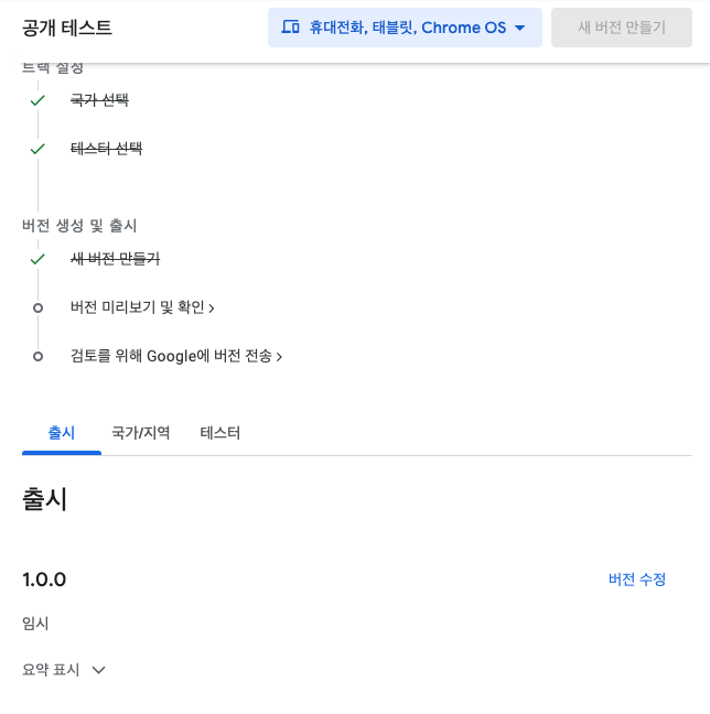 Play Console에 로그인하여 앱 전용 프로젝트를 만드는 방법과 개발자용 계정을 만드는 방법은 생략하겠습니다.