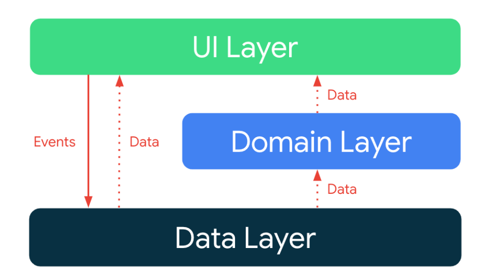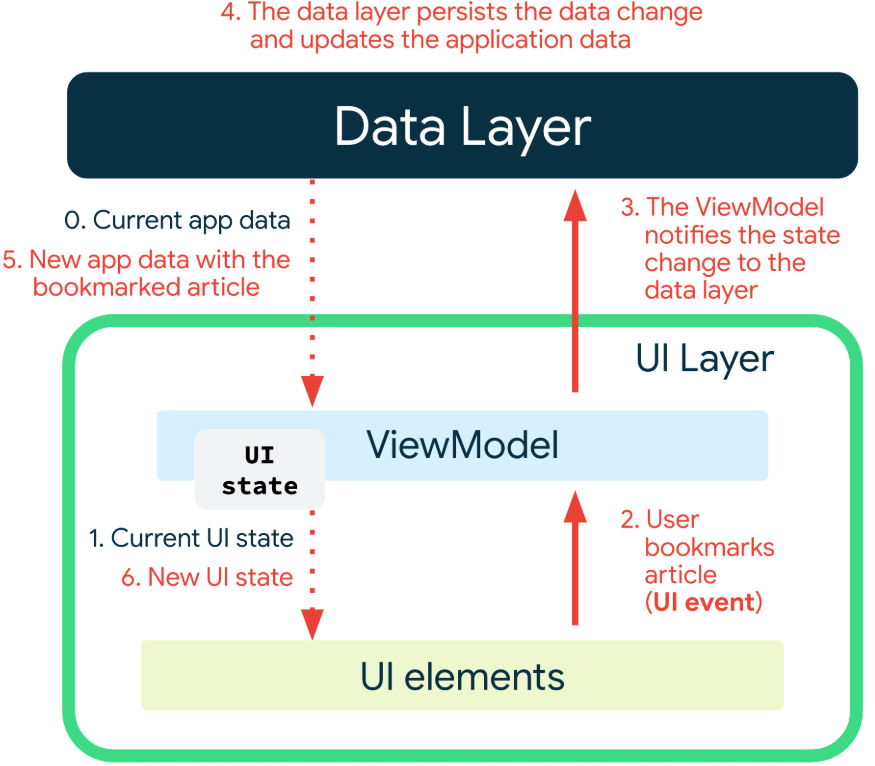 여기서 단방향이란 Data Layer → UI Layer → Data Layer → UI Layer ... (반복) 흐름으로만 데이터가 전달되어야하며