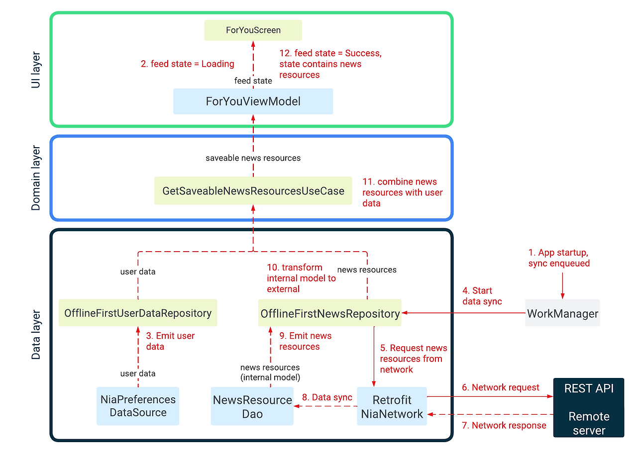 즉, 다음과 같은 아키텍처를 따라서 Now in Android 앱도 만들었다고 볼 수 있습니다.