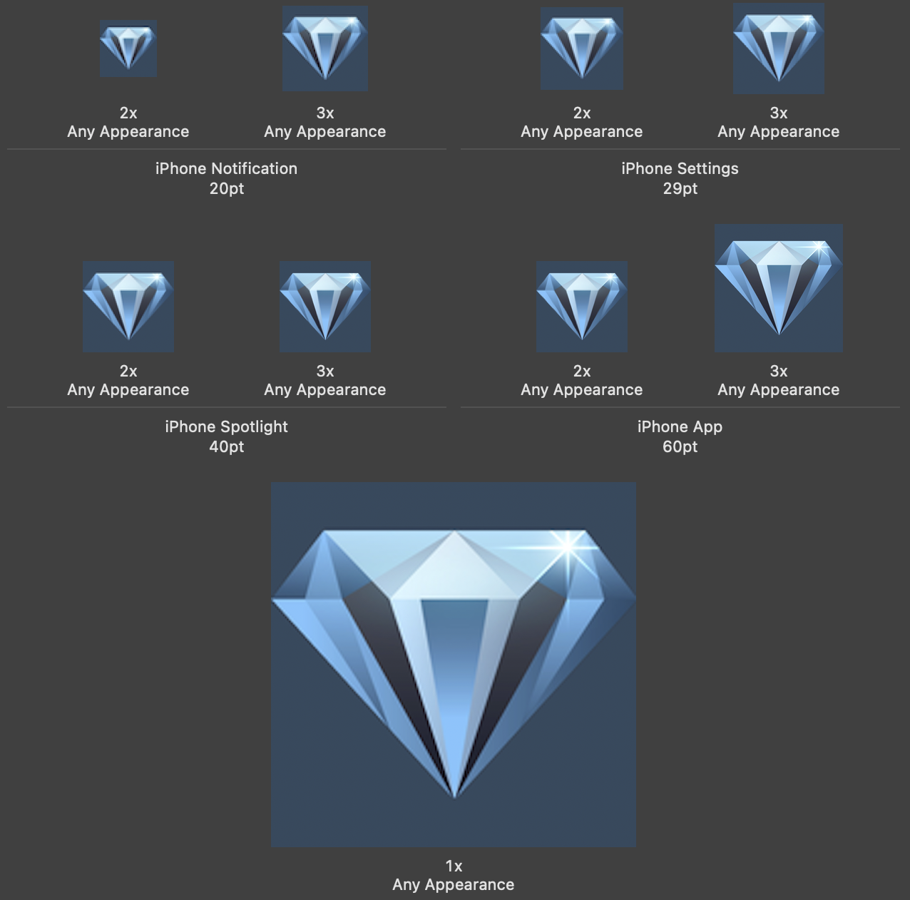 iOS는 다음과 같이 다양한 크기의 앱 아이콘을 셋팅해야합니다.