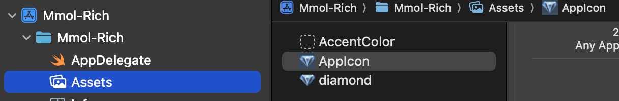 Xcode에서 왼쪽의 Assets을 사용하여 앱 아이콘을 지정할 수 있고 그림으로 사용할 이미지 파일도 넣을 수 있습니다.