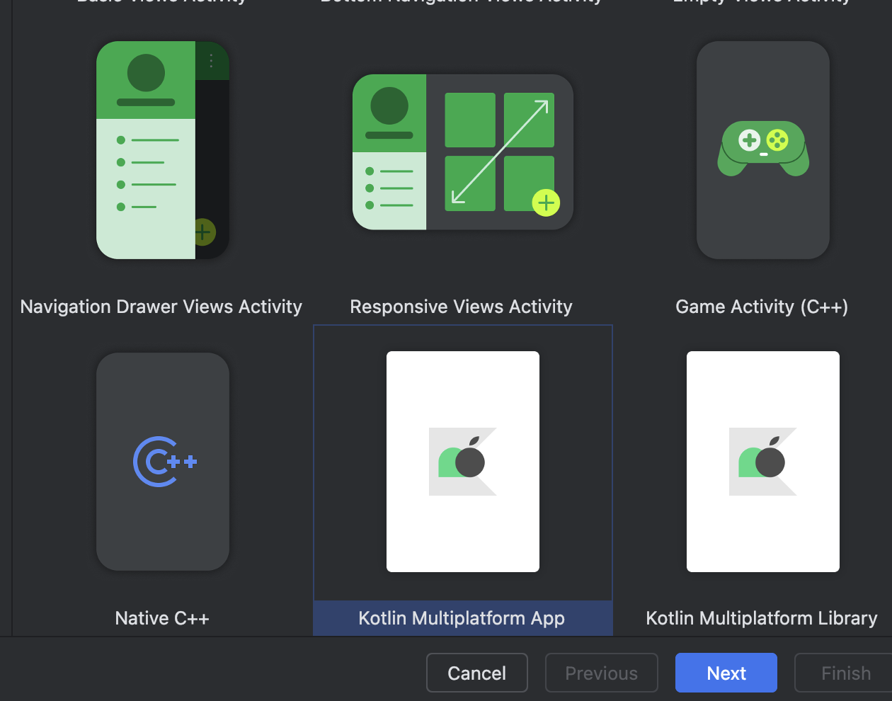 이후 Android Studio로 새로운 프로젝트를 만드려고 하면 다음과 같이 Kotlin Multiplatform app을 볼 수 있습니다.