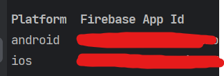 다음과 같이 android와 ios의 firebase app ID가 출력되는 것을 확인할 수 있습니다.