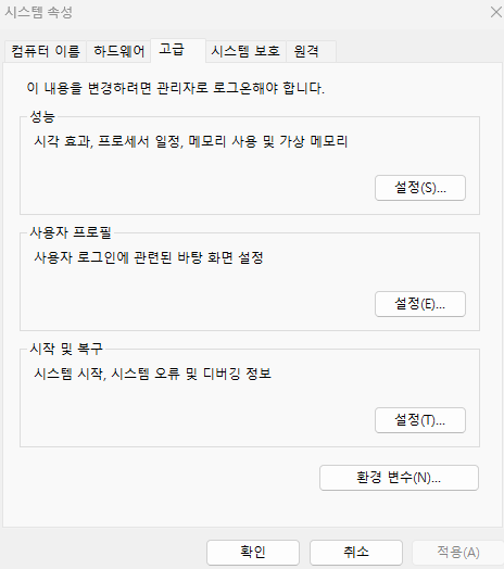 그럼 다음과 같은 "시스템 속성"창을 볼 수 있습니다.