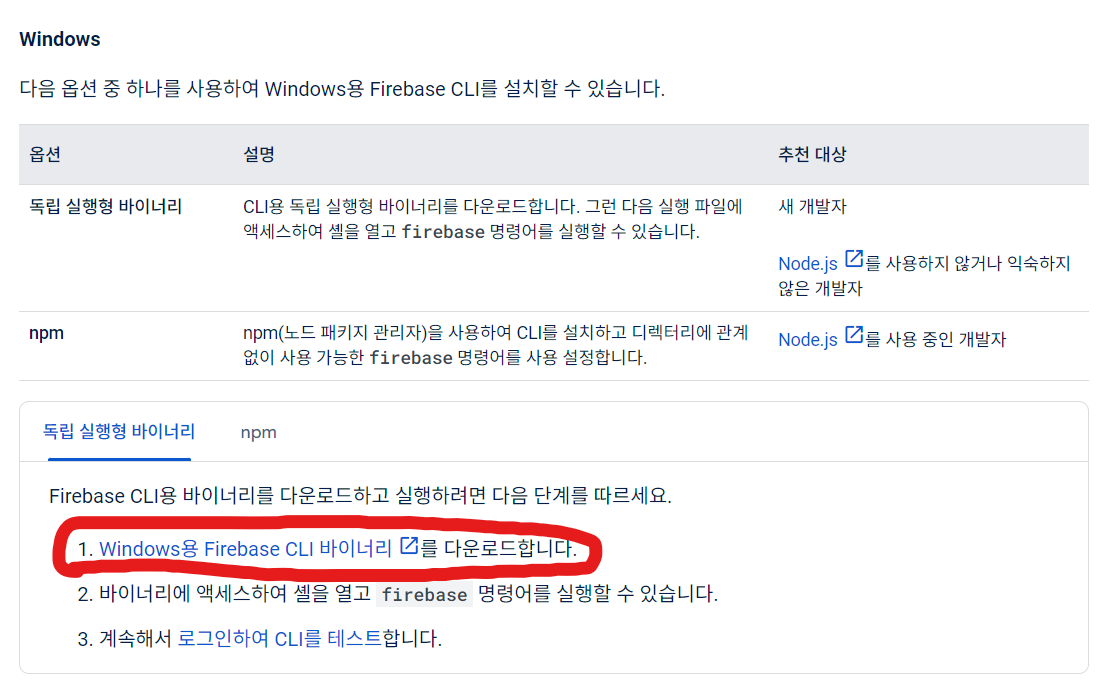 CLI 설치는 Firebase에서 가이드라인이 나와있습니다.