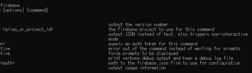 위 과정까지 완료했다면 cmd 또는 터미널에서 firebase 커맨드를 사용할 수 있습니다.