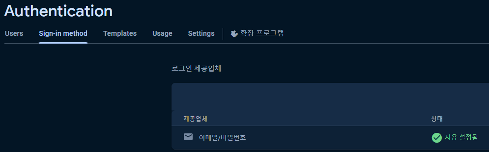 이번 포스팅에서는 Email을 사용하여 인증을 하는 방법을 소개할 예정이기 때문에 이메일/비밀번호를 선택합니다.