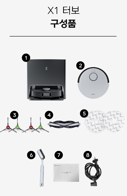 에코백스 X1 터보의 구성품은 다음과 같습니다.